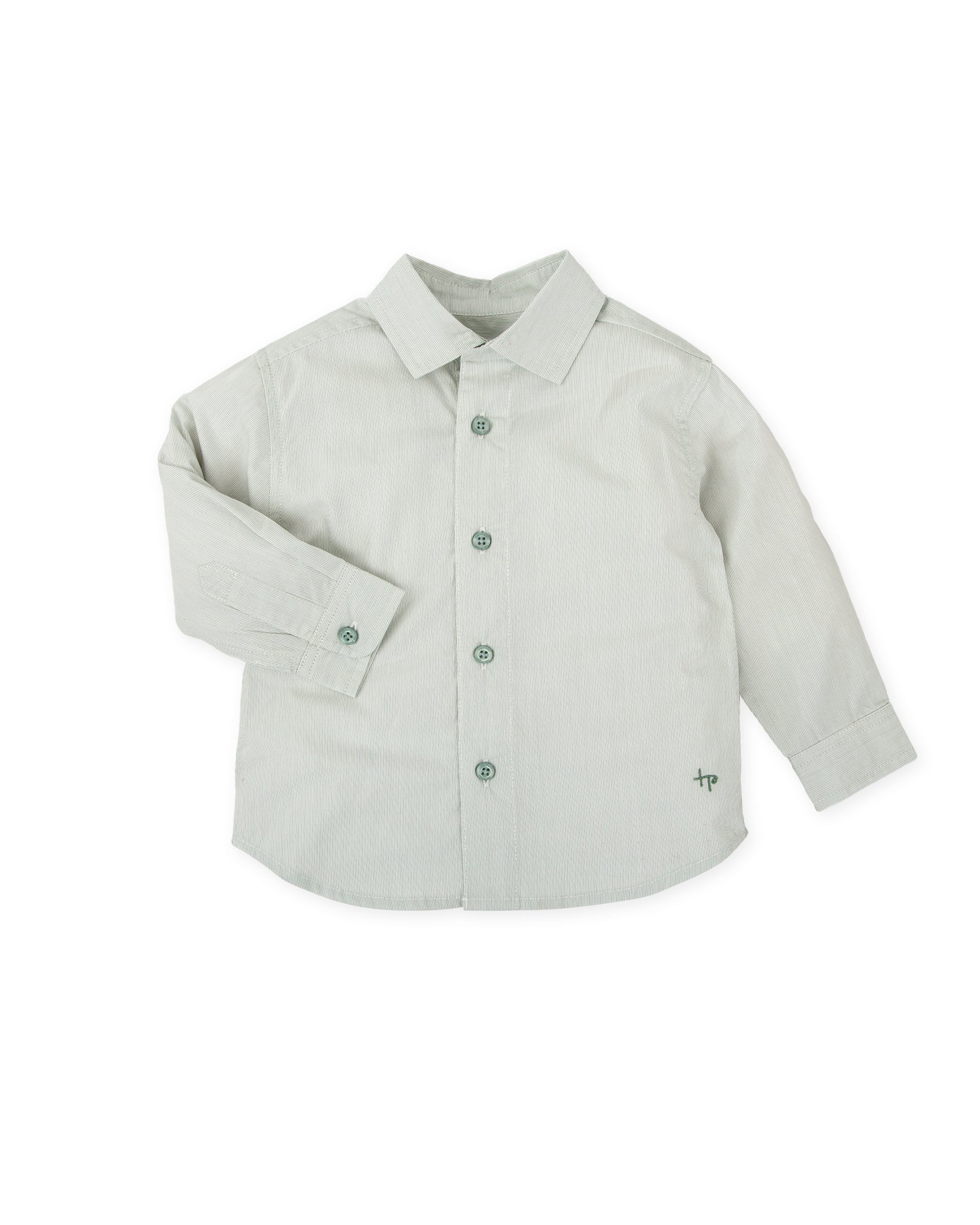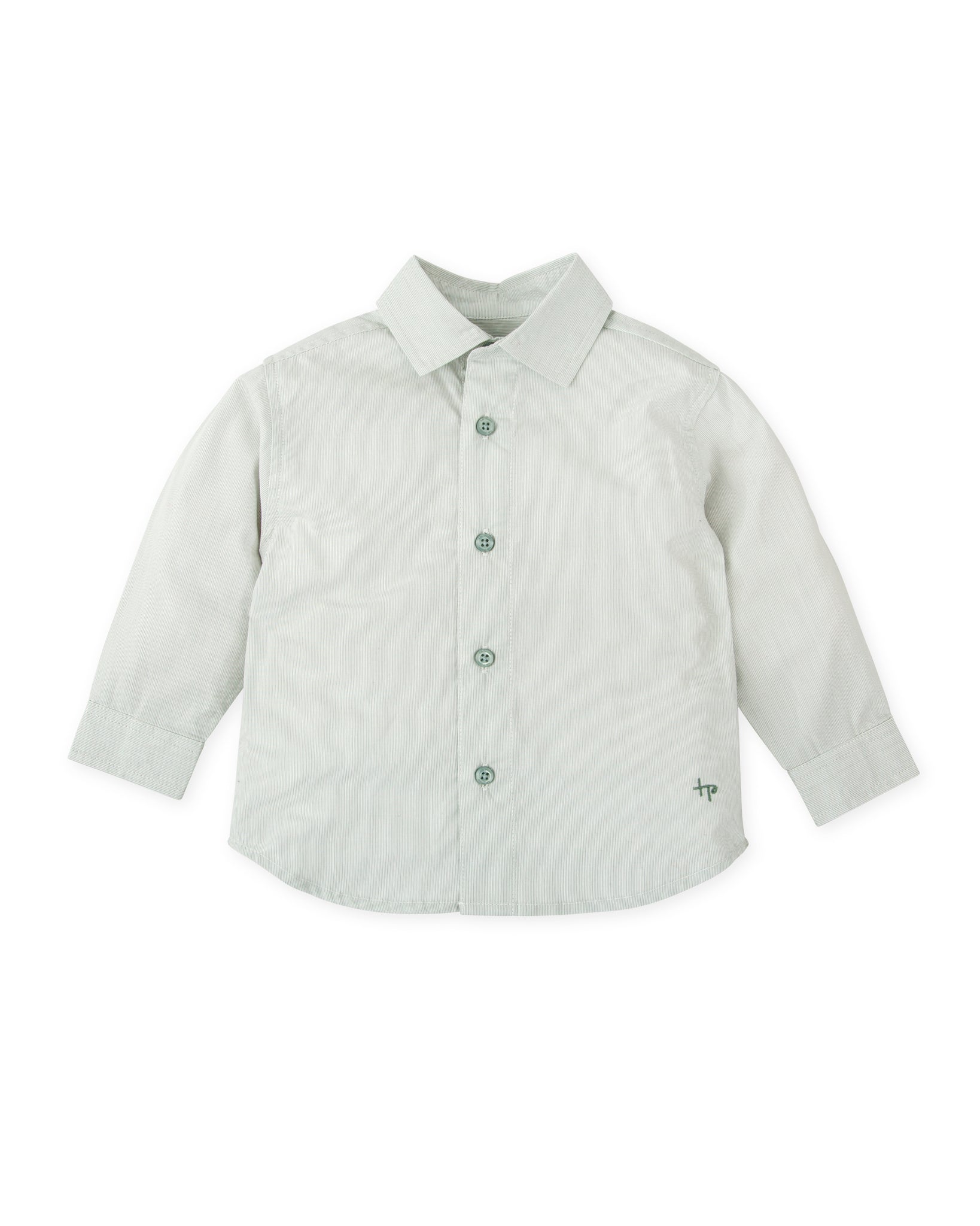 A timeless classic reimagined for little gentlemen. This long sleeve button-down shirt is crafted in soft sage green striped poplin, perfect for both special occasions and everyday outings. Featuring a pointed collar, button front closure, and a subtly embroidered TP logo at the hem, it’s the perfect blend of comfort, polish, and style.