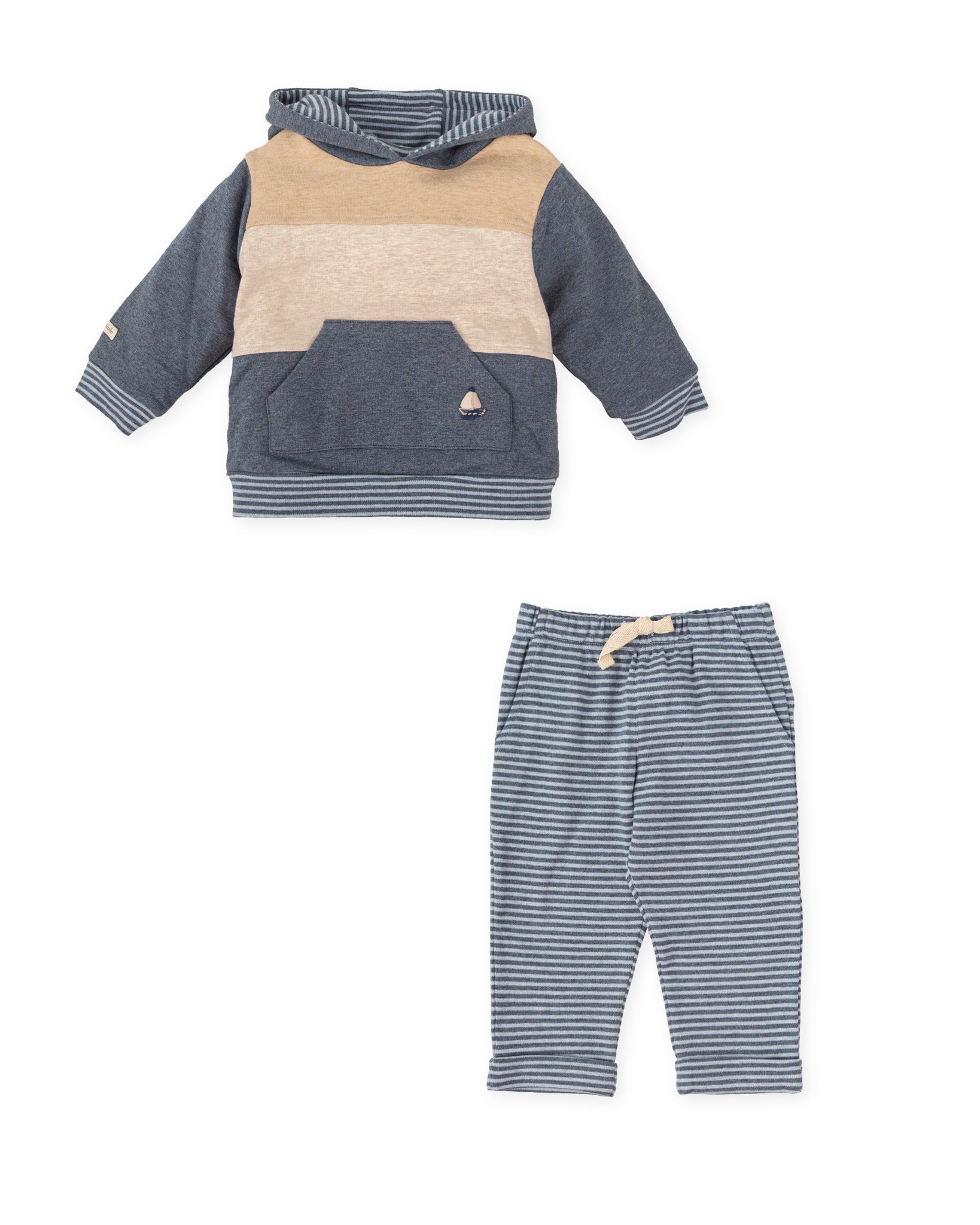 This soft and stylish two-piece set is perfect for chilly days. The cozy sweatshirt features a warm navy fleece with sand and cream color-blocked stripes, a practical hood, and a front pouch pocket for extra cuteness. It pairs with ultra-comfortable striped interlock pants, complete with an elastic waistband and side pockets for all their little treasures.