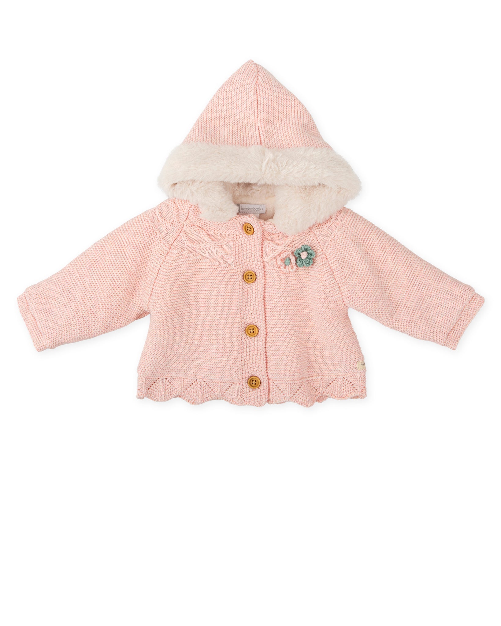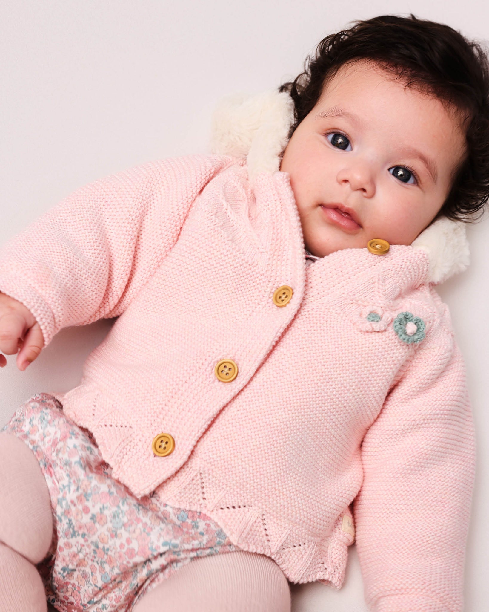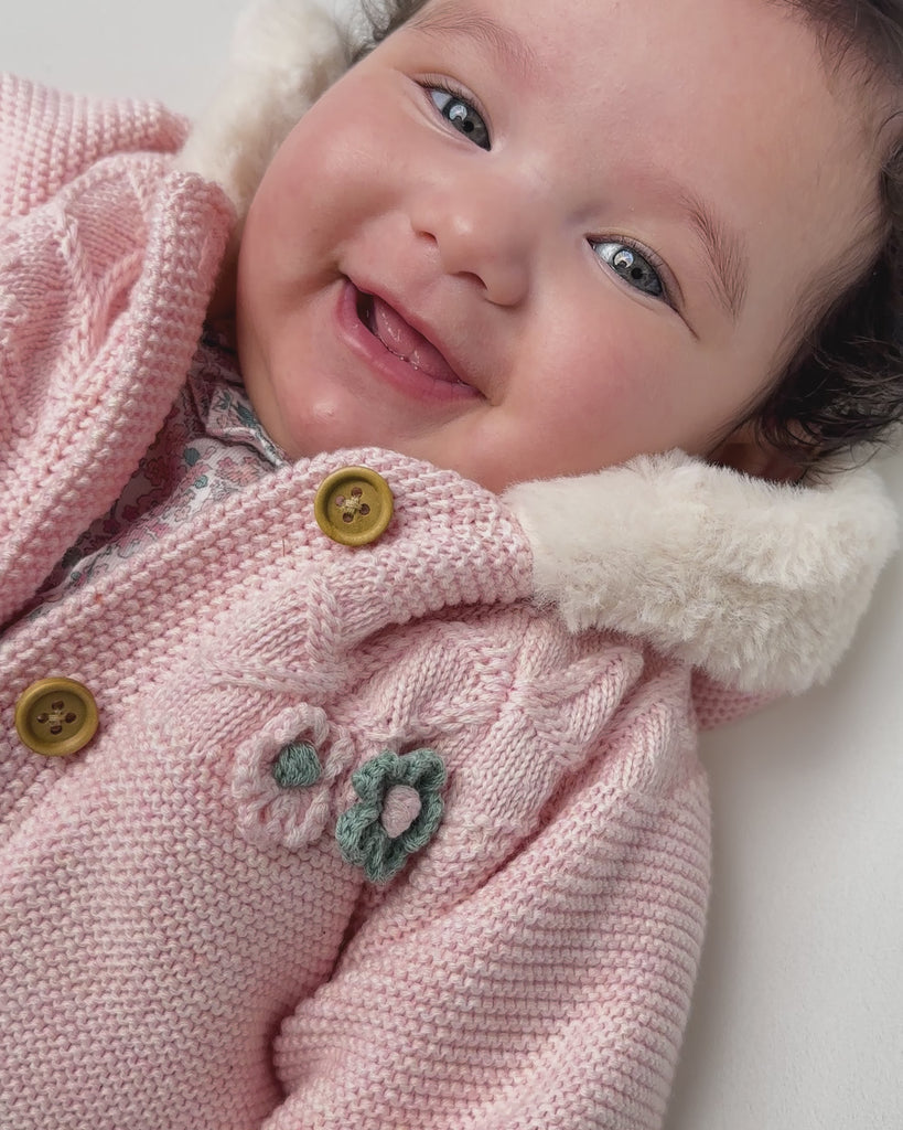 Wrap your little one in warmth and charm with this adorable knit hooded coat in soft pink. Fully lined with plush faux fur and detailed with delicate knit patterns and a mini floral accent on the chest, it combines elegance and comfort for chilly winter strolls. The front button closure makes dressing easy and secure.