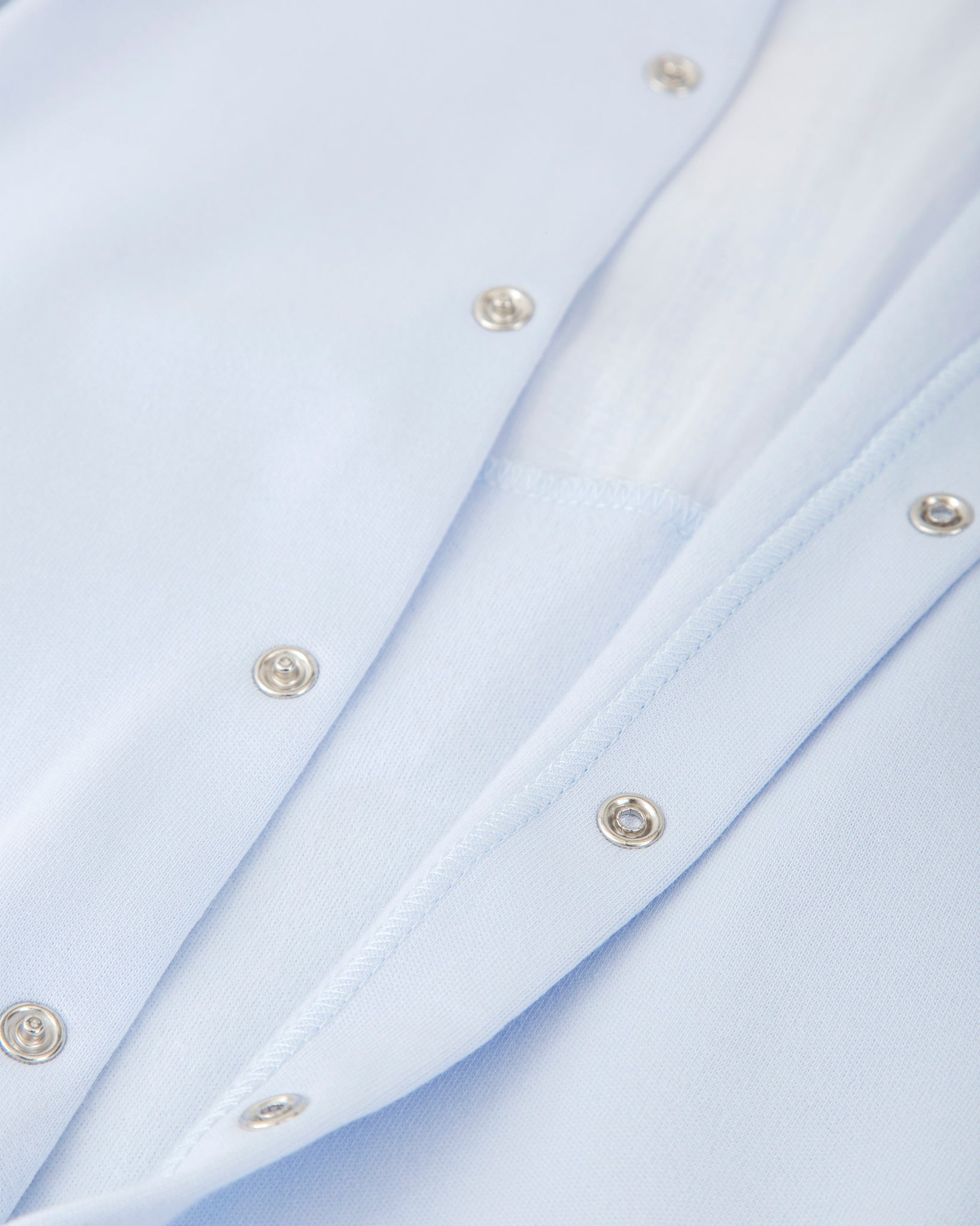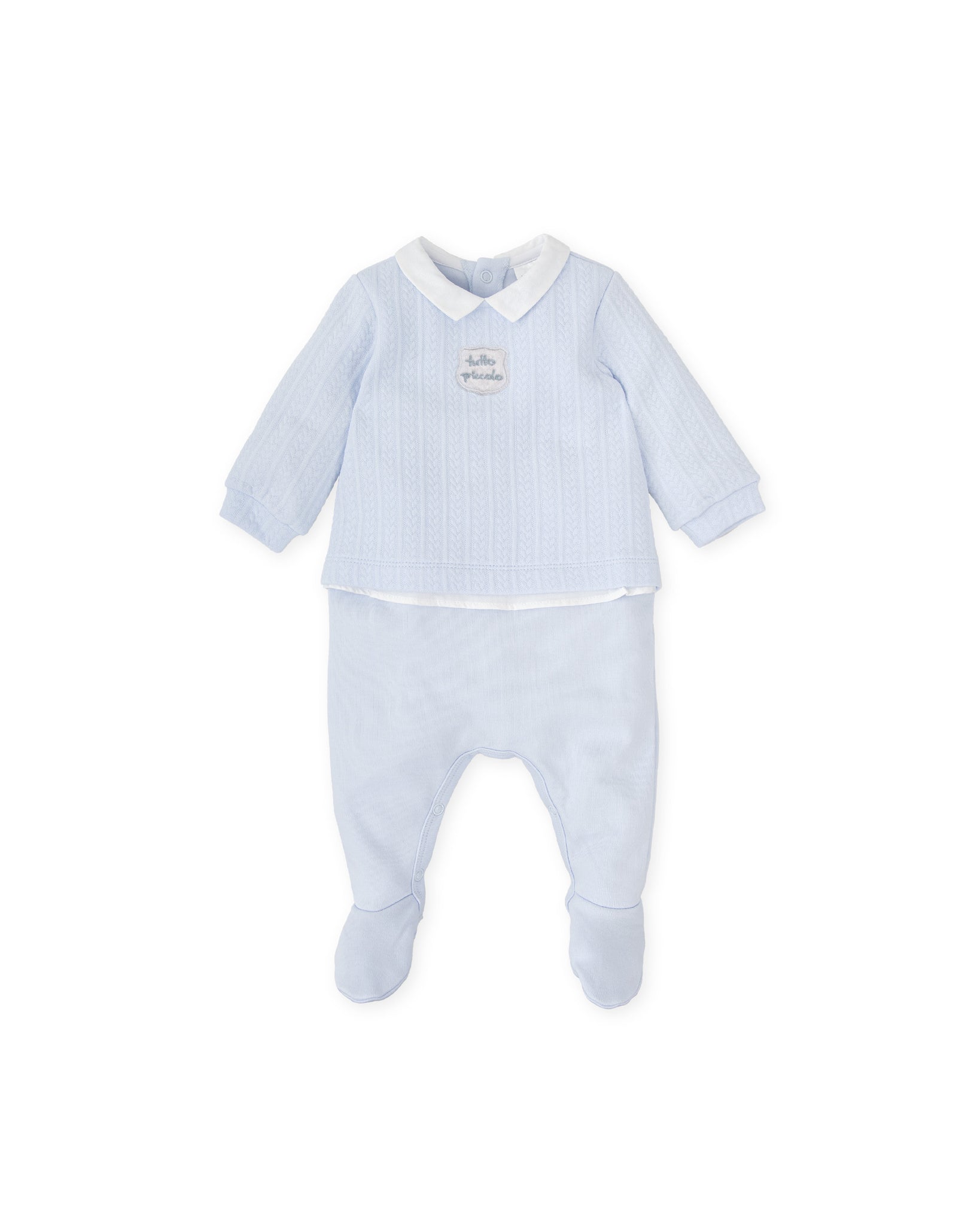 A cozy essential for baby’s first wardrobe, this baby blue footie combines classic charm with everyday comfort. The long-sleeve top features a subtle cable knit effect, white Peter Pan collar, and embroidered crest detail, all paired with soft matching pants with built-in feet. Crafted in cotton with full snap closures along the back and inseam for easy changes.