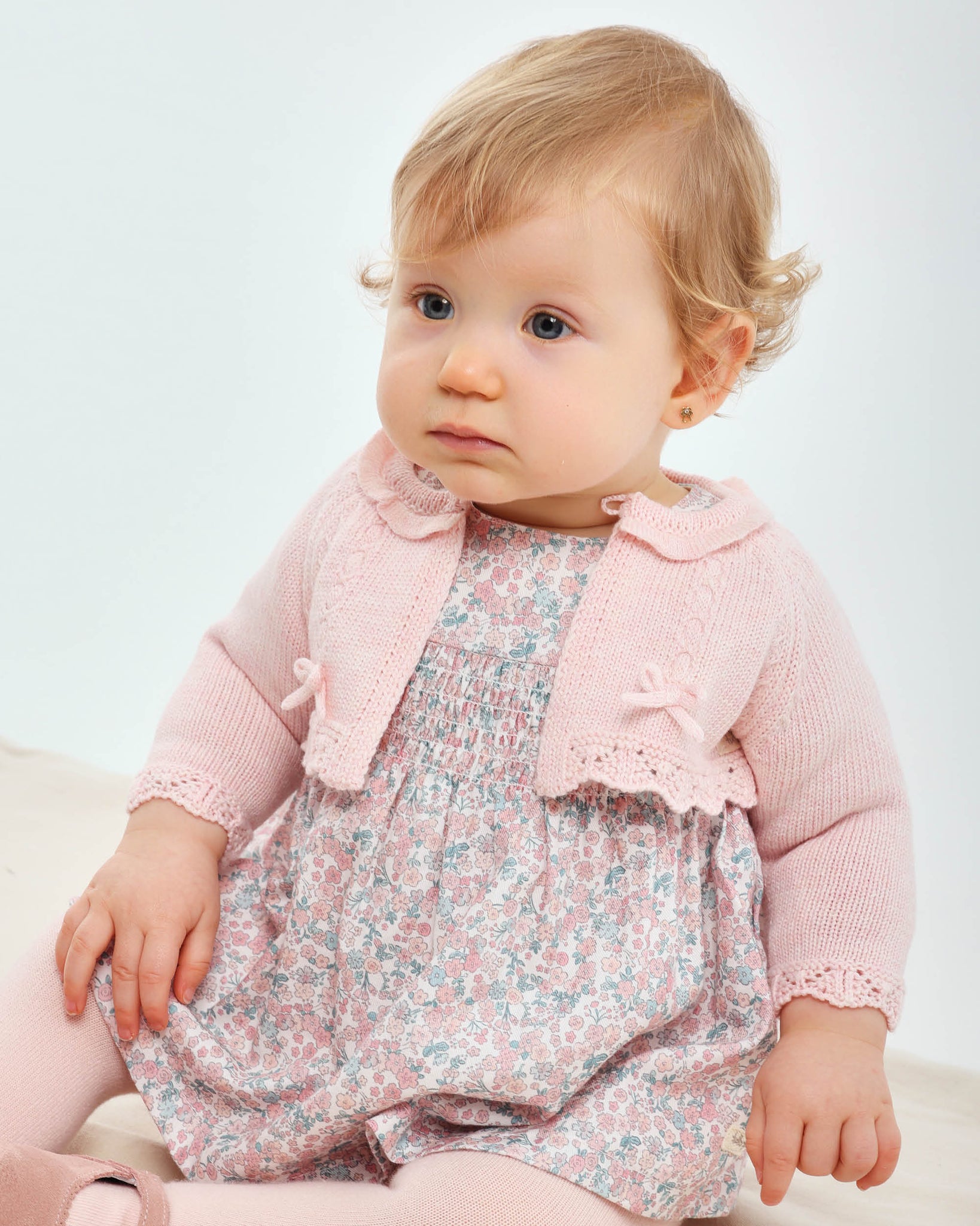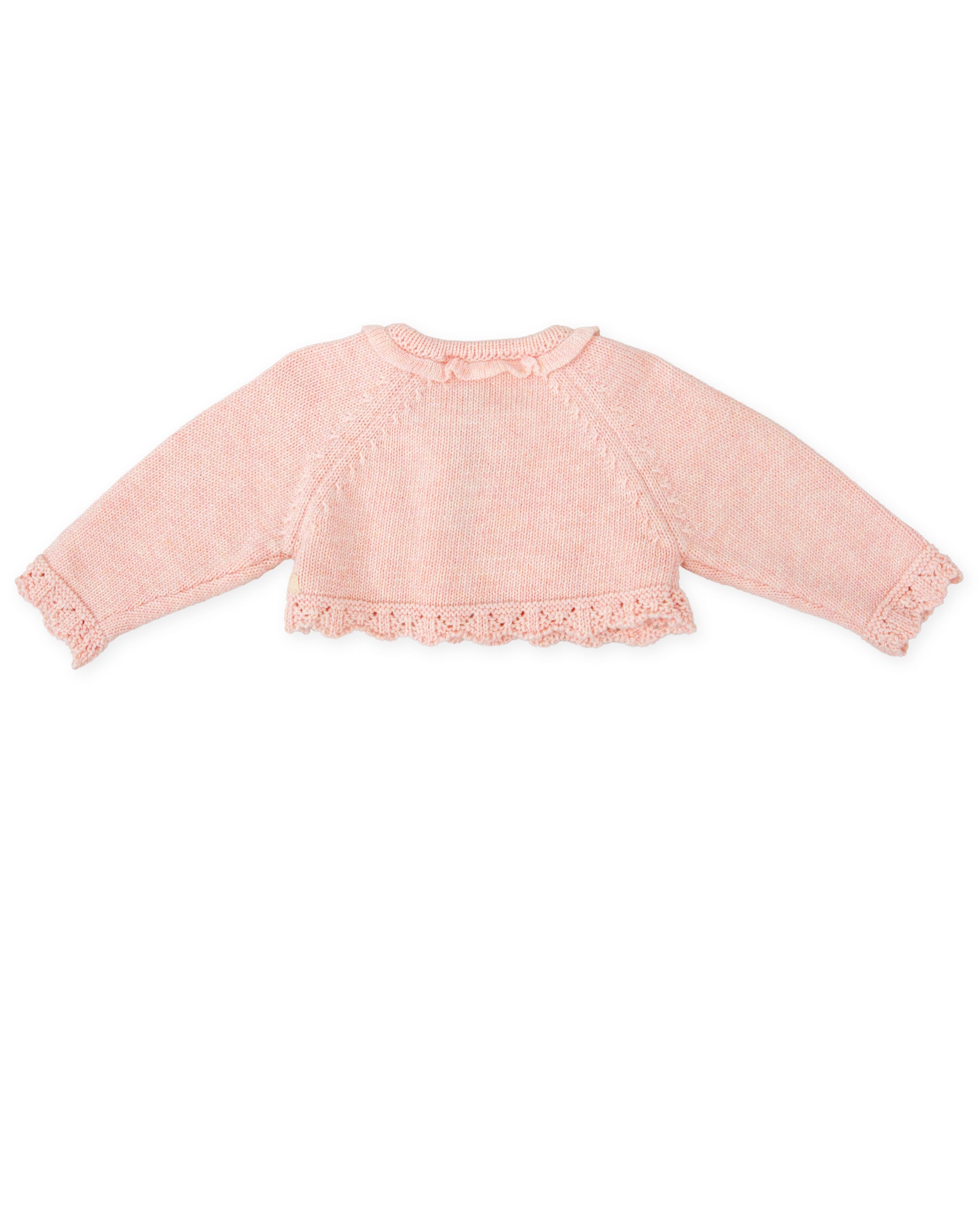 This soft pink knit baby cardigan adds a sweet and delicate touch to any fall outfit. Made from soft, cozy yarn, it features subtle decorative stitching, tiny bows on the front, and scalloped lace-effect trim. A hidden front button keeps it secure without interrupting the design. Ideal for layering on chilly days or special outings.