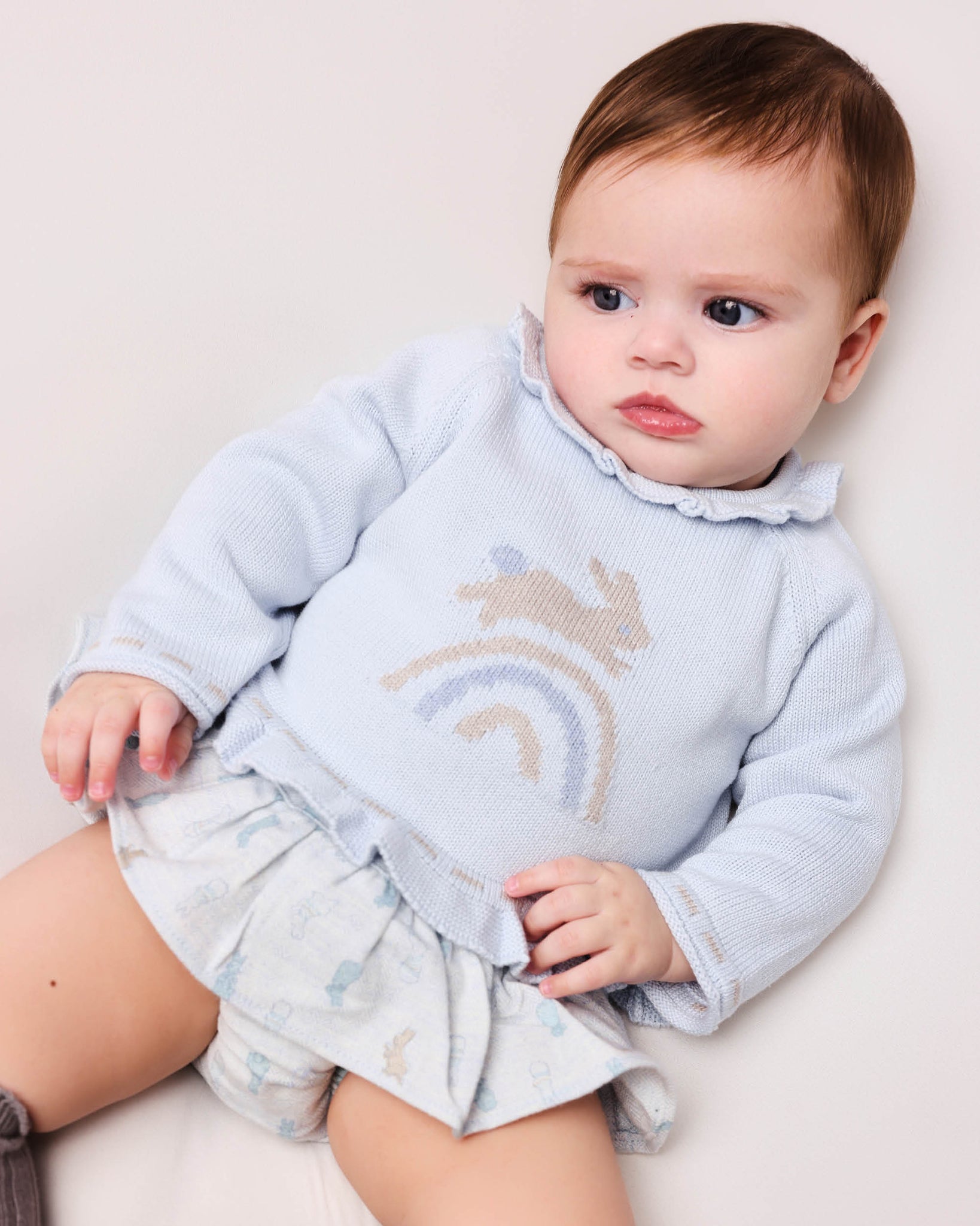 This charming baby bloomer in soft blue features an exclusive bunny print on a cozy textured fabric. With its delicate ruffle detail and gentle elastic at the waist and leg openings, it ensures a snug yet comfy fit for everyday wear or special family moments. Designed to be layered with tights on cooler days or worn solo for playful indoor days. Why Parents Love It: