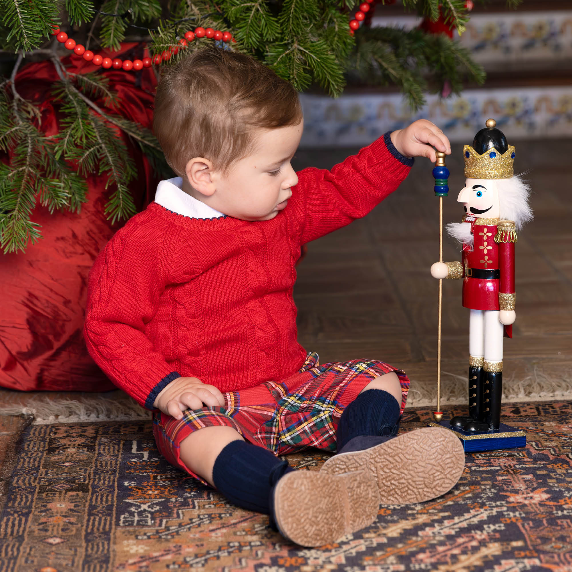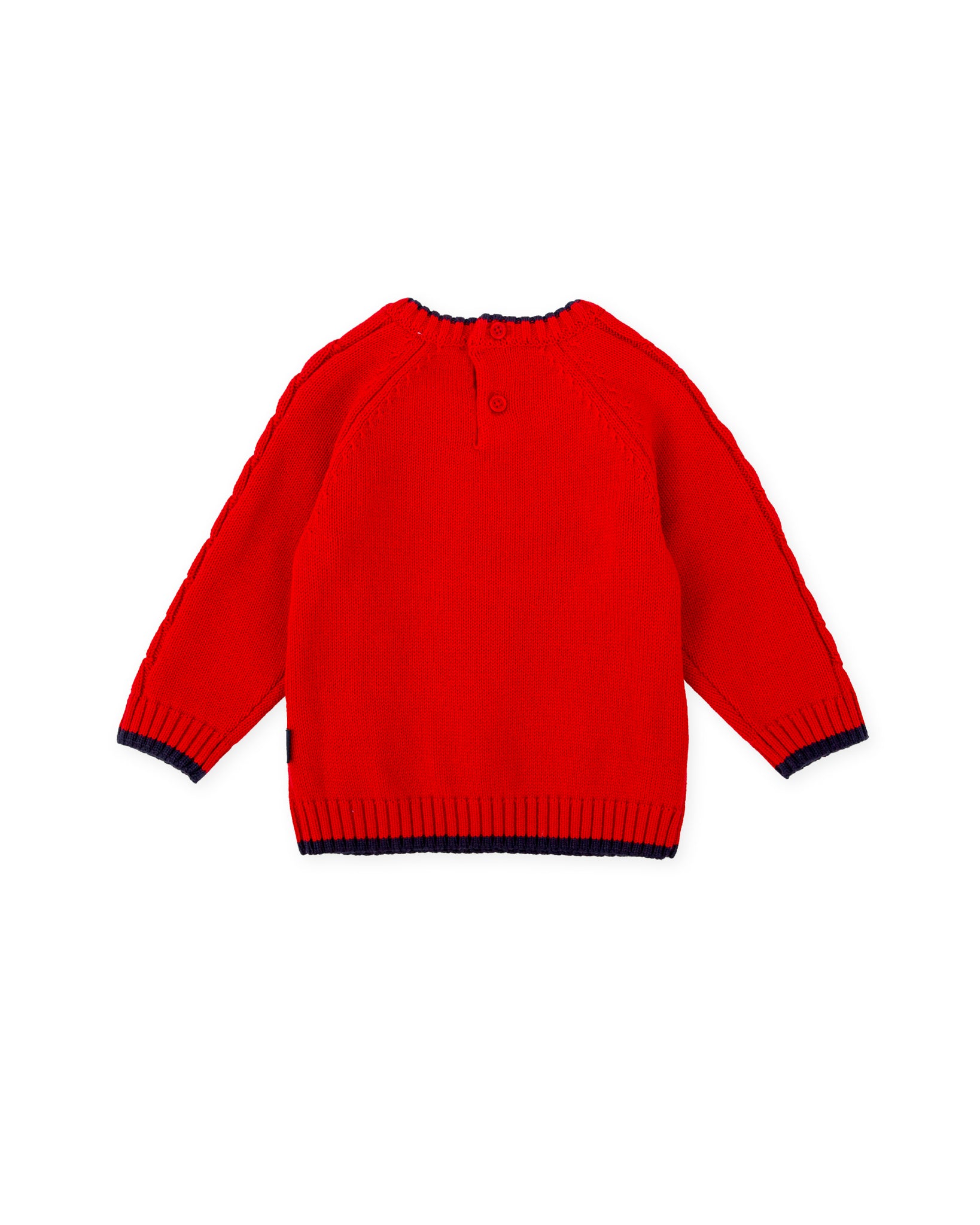 A timeless cold-weather staple, this red cable-knit sweater wraps little ones in comfort and charm. Made from a soft cotton blend, it features traditional cable detailing on the front and sleeves, ribbed trims in navy blue for a crisp contrast, and a practical back opening with buttons for easy dressing (closed on larger sizes).