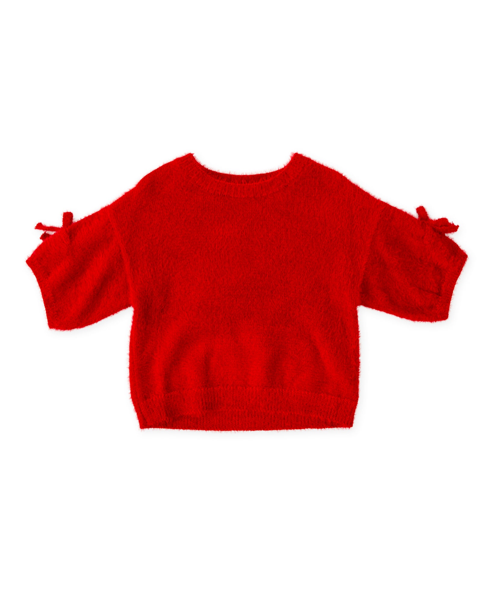 This ultra-soft red sweater brings a cozy mohair-effect knit to little wardrobes. With a relaxed cut and playful bow details at the sleeves, it’s the perfect blend of comfort and charm. Finished with stretchy ribbed trims for an easy fit, it layers beautifully over dresses or skirts for the festive season.