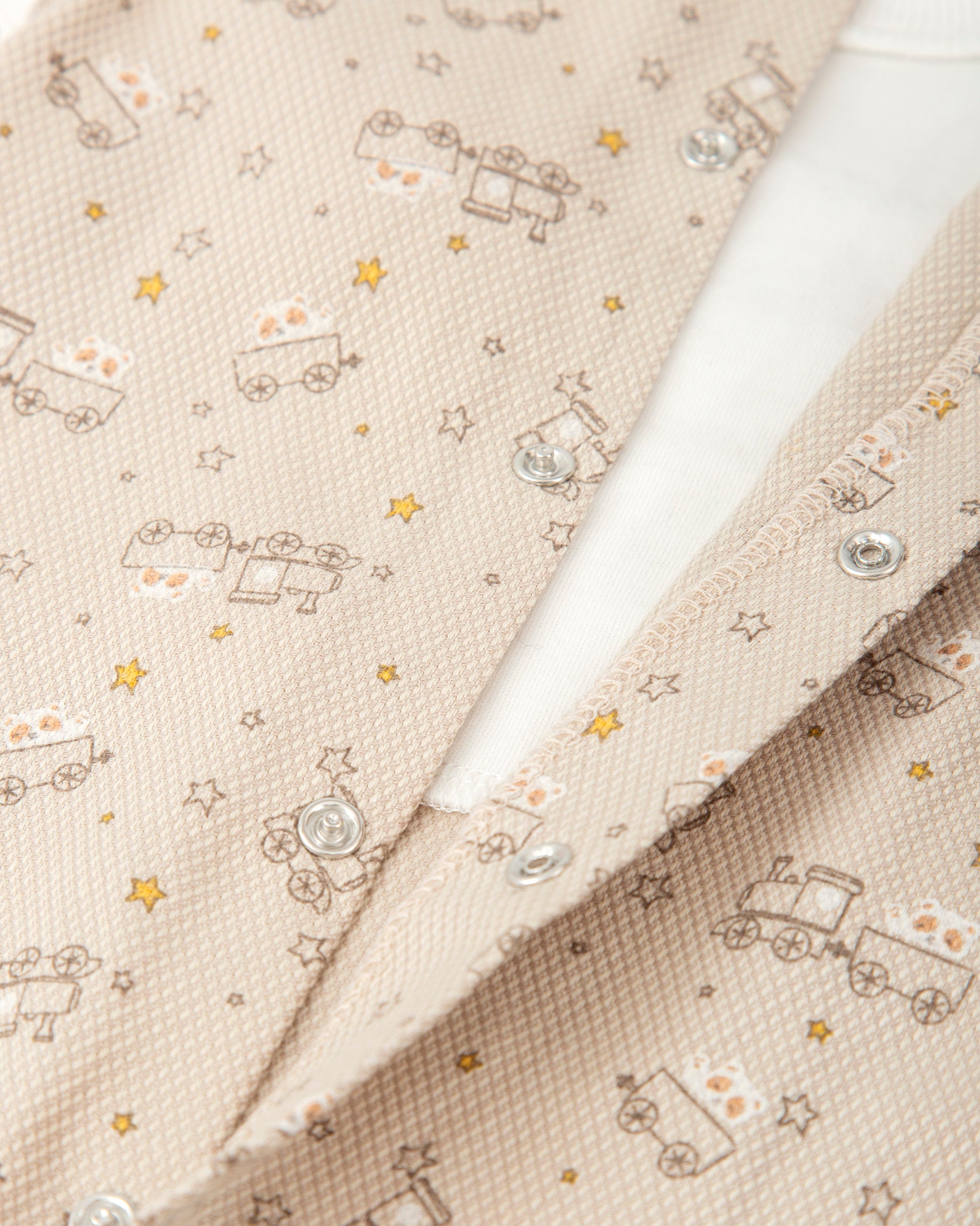 A soft and cozy all-in-one that looks like a dungaree set but feels like your baby’s comfiest outfit. This beige romper features a charming train print on a textured fabric with an ivory cotton top. The front pocket and wooden-style buttons add a sweet, playful touch. Snap openings at the back and inseam make diaper changes a breeze.