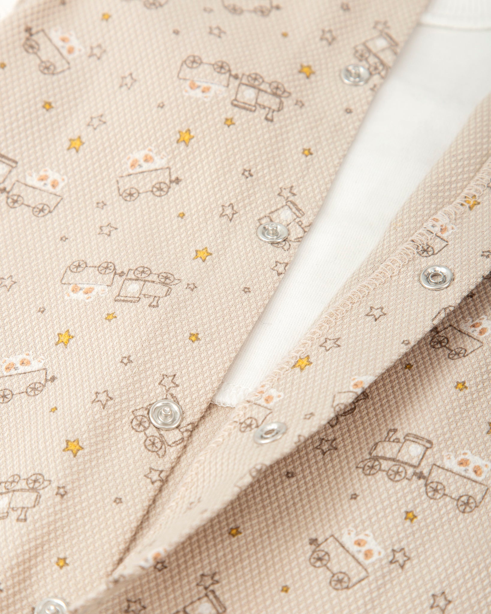 ONE-PIECE ROMPER IN BEIGE TRAIN PRINT