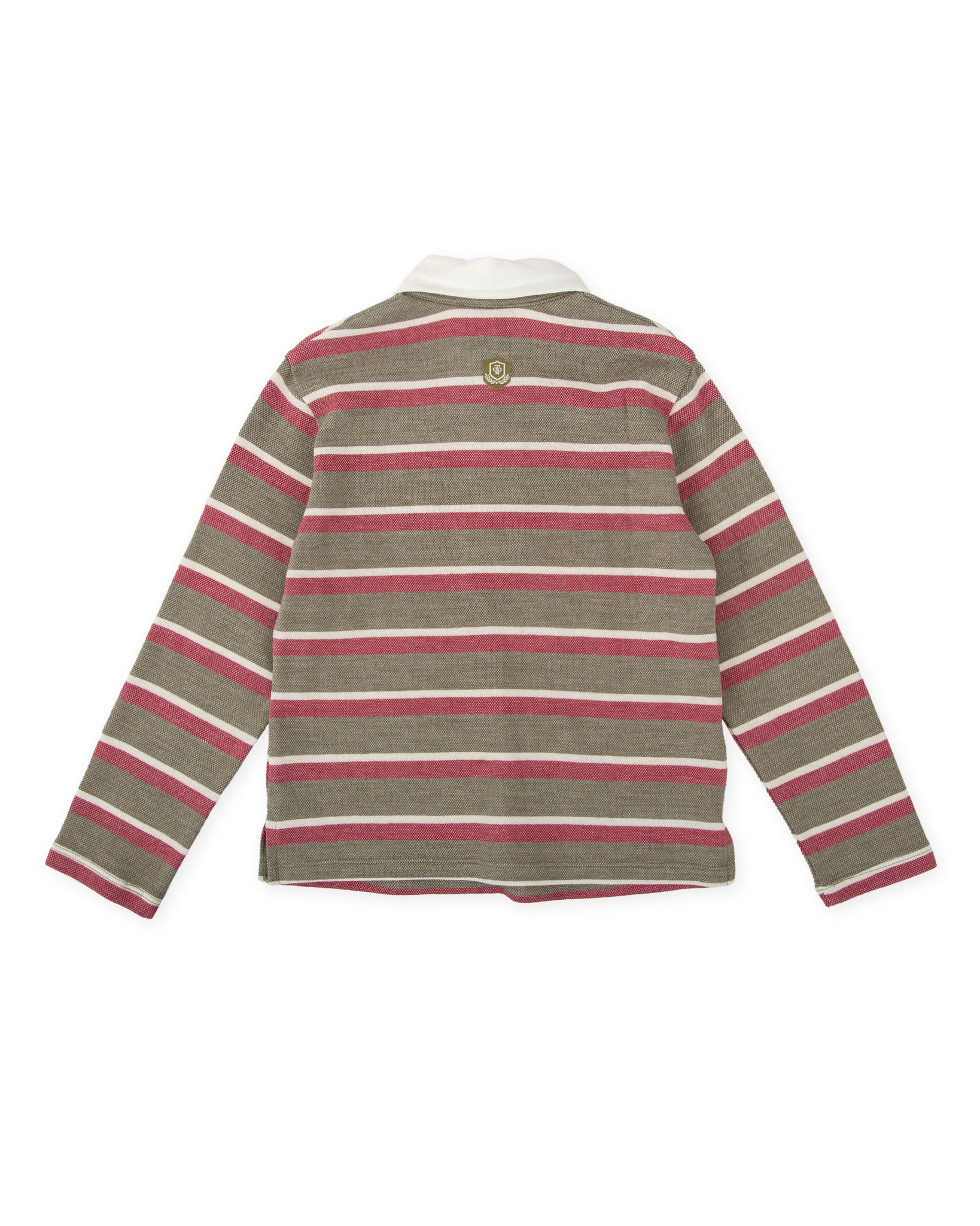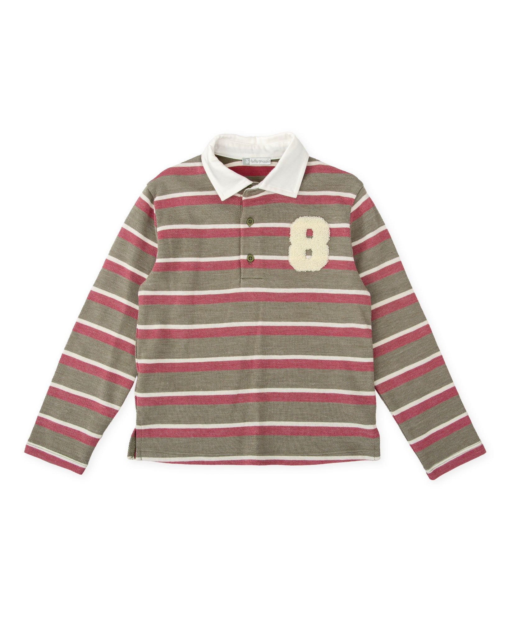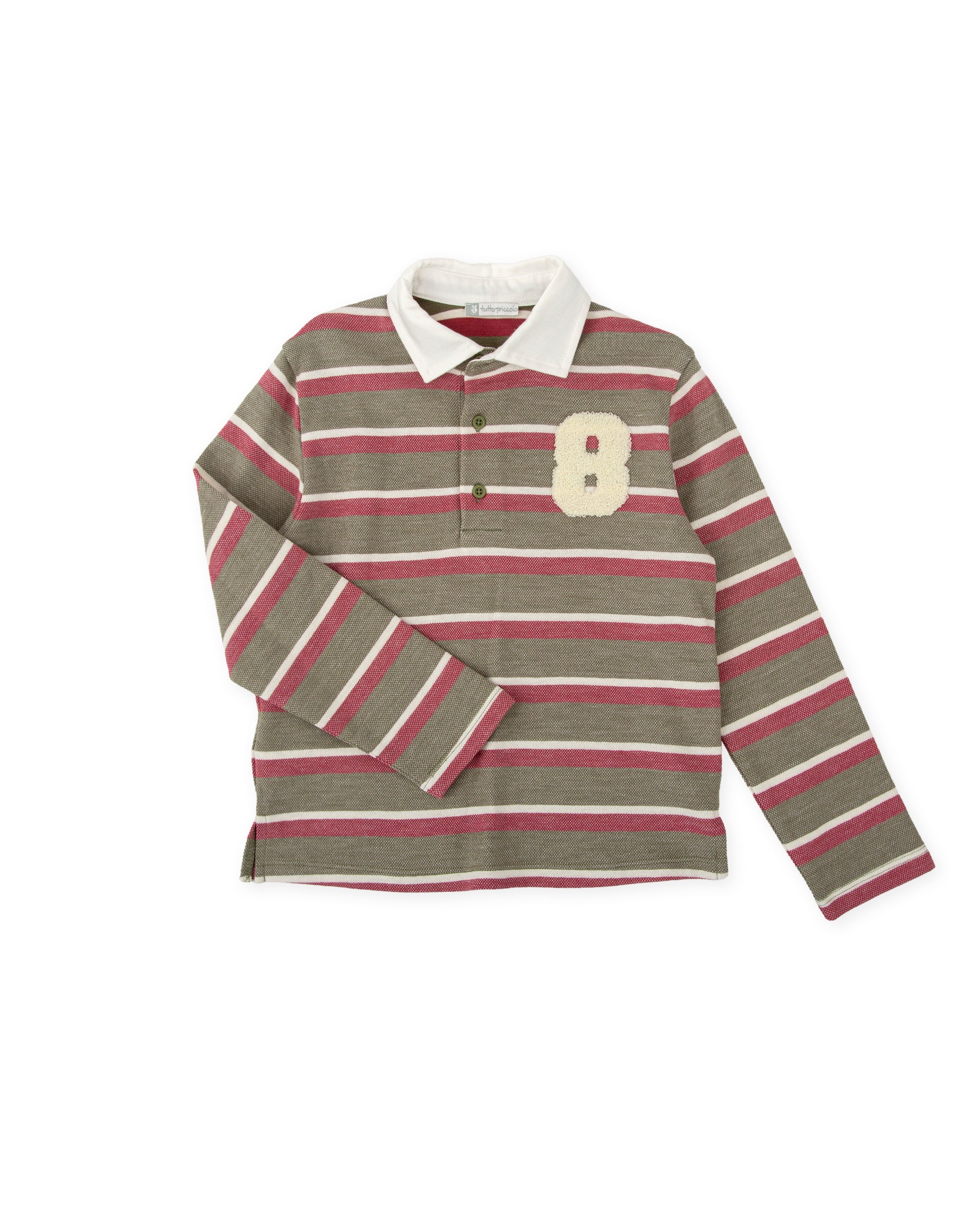 A playful twist on the classic rugby shirt, this long-sleeve POLO SHIRT in olive green, cream, and burgundy stripes is made from soft piqué cotton and finished with a textured number patch for a sporty look. Features side slits and a crisp white collar, perfect for layering on school days or weekends with friends.