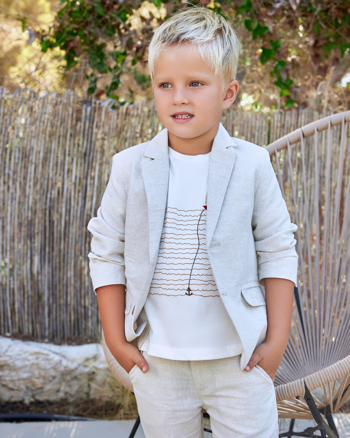 This sand beige blazer brings a refined, tailored look to warm-weather outfits while staying lightweight and comfortable for little ones. Designed with a classic silhouette and front button opening, it’s ideal for ceremonies, family celebrations, or elevated everyday looks.
