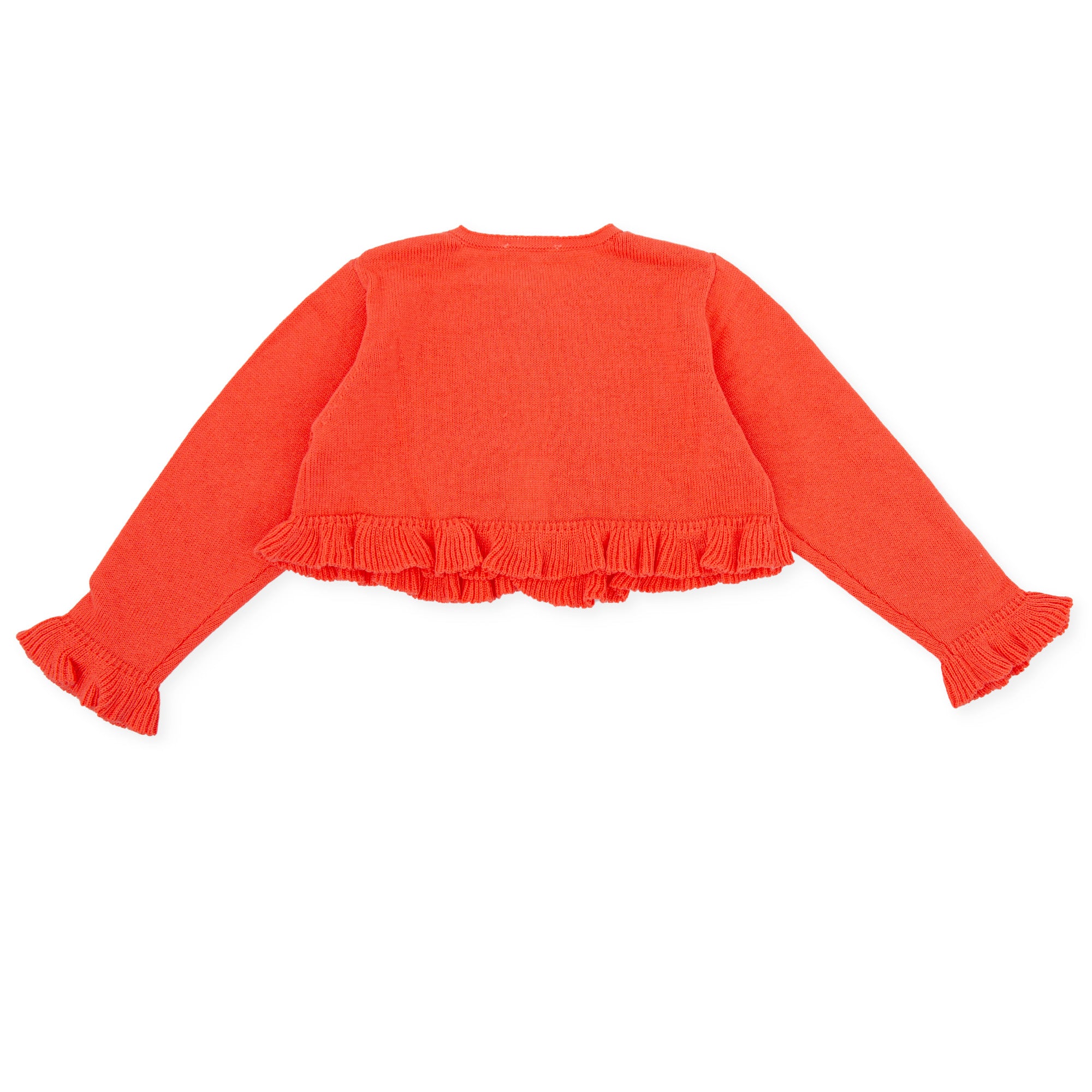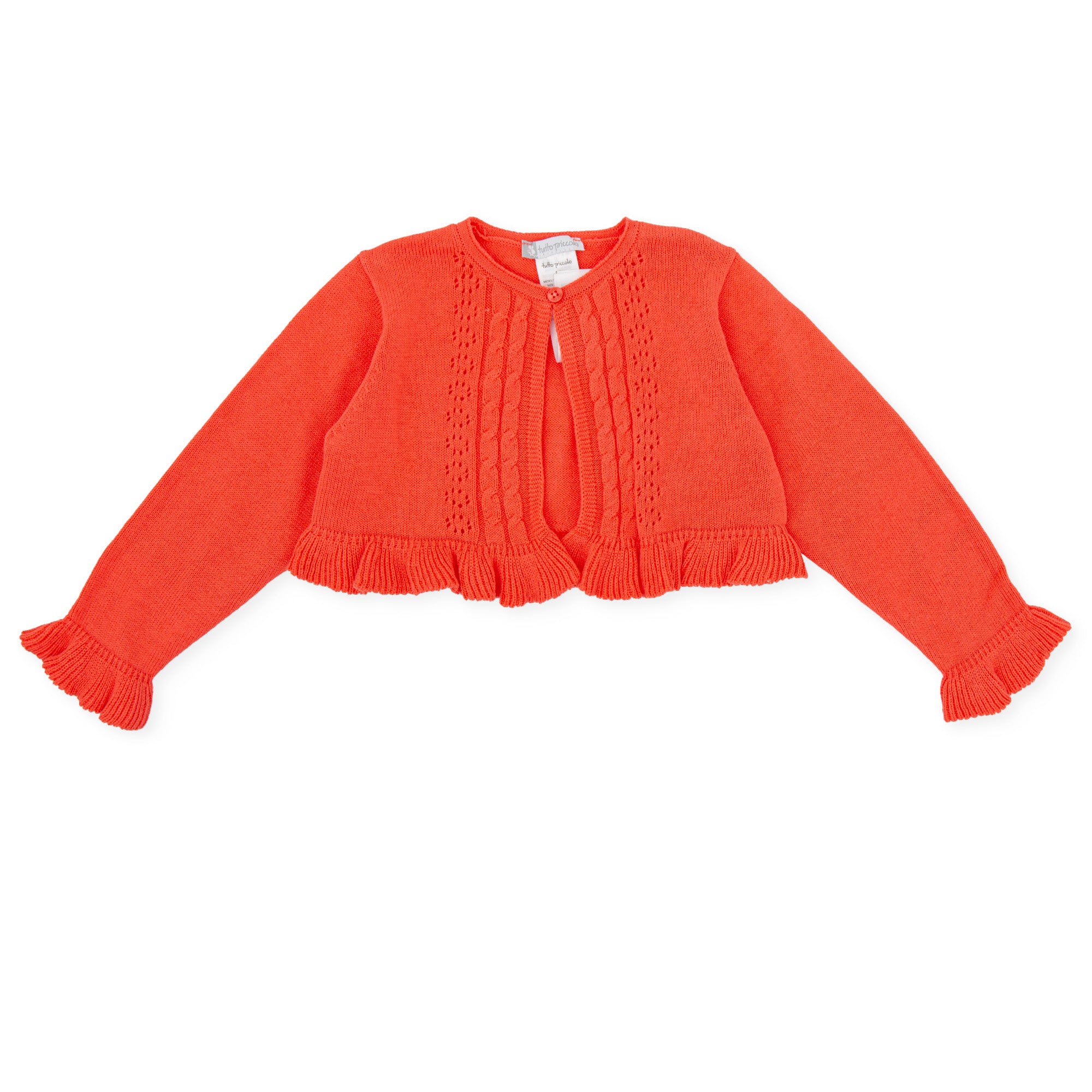Tricot jacket with braid detail on the front. Ruffle on cuffs and hem. Three colour versions: coral, strawberry and red.