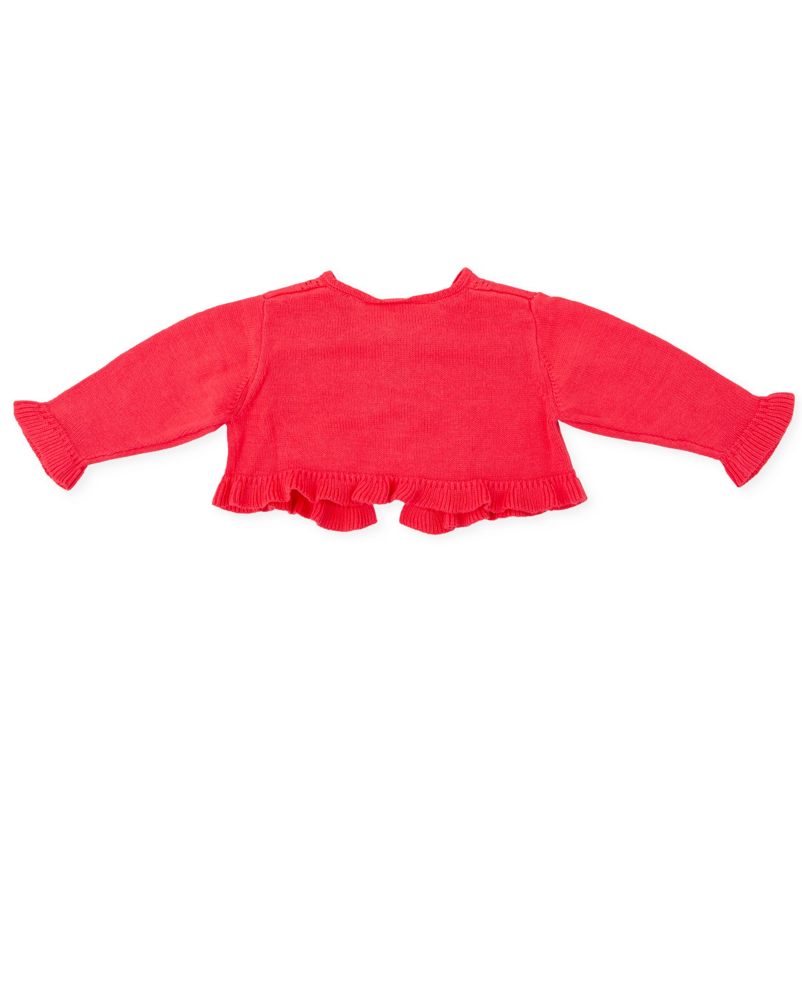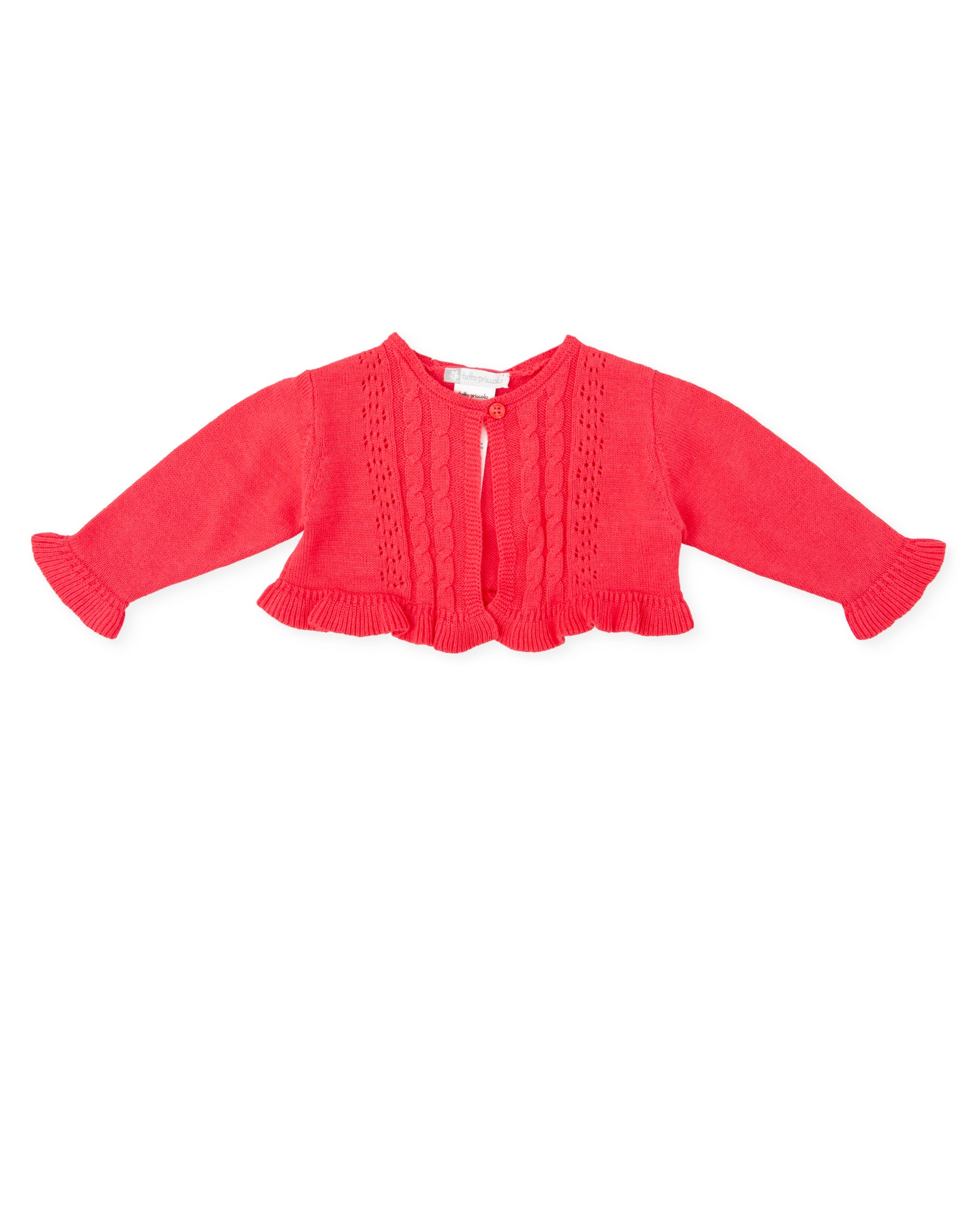A bright, beautiful layer for her most important moments. This classic coral pink bolero cardigan features a delicate knit pattern and a stylish short-waisted design. It is the perfect choice for parents looking to add a pop of color to white baptism dresses, family photo outfits, or spring birthday parties where she needs a little extra warmth without losing her "boutique" look.