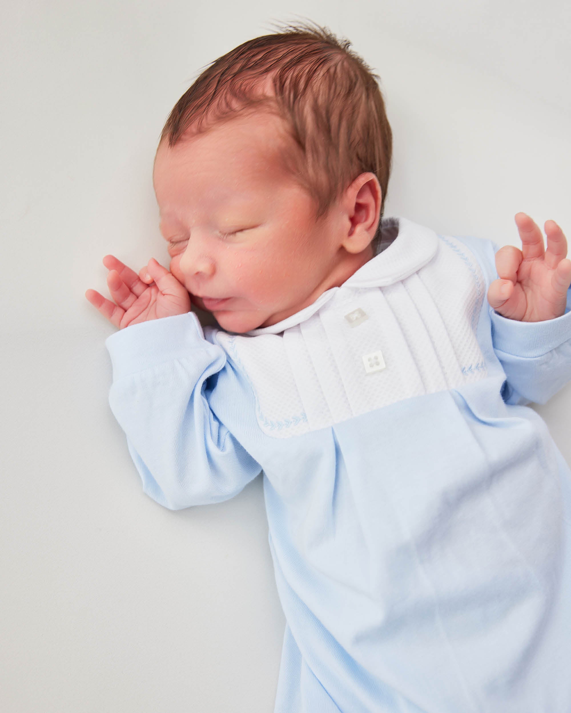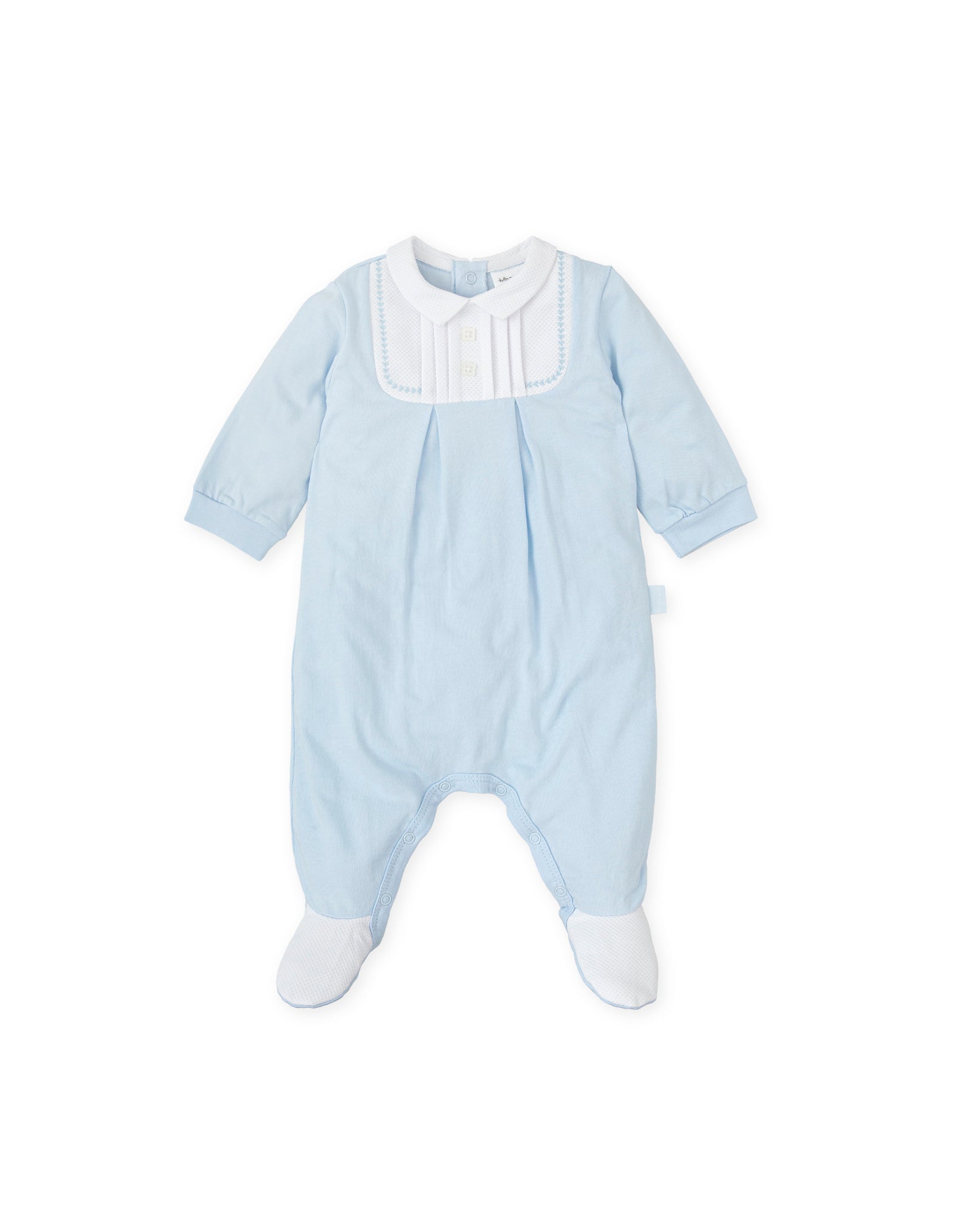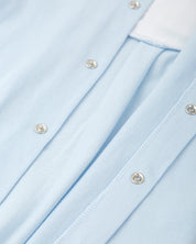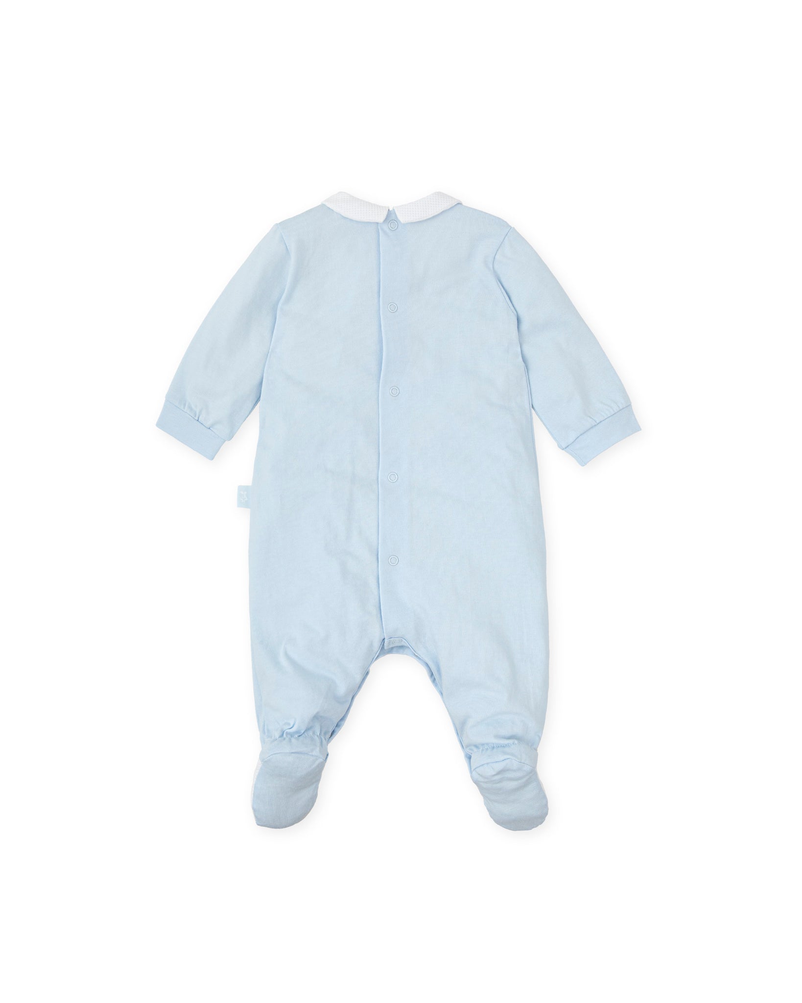 This adorable baby blue onesie is a cozy essential for your little one’s first months. Made from 100% cotton, it features a classic collar, delicate front paneling, and full foot coverage to keep your baby snug. Designed for newborns, it includes back and bottom snaps for easy diaper changes without disrupting sleepy cuddles. Perfect for newborn gifts, baby showers and newborn everyday outfit.